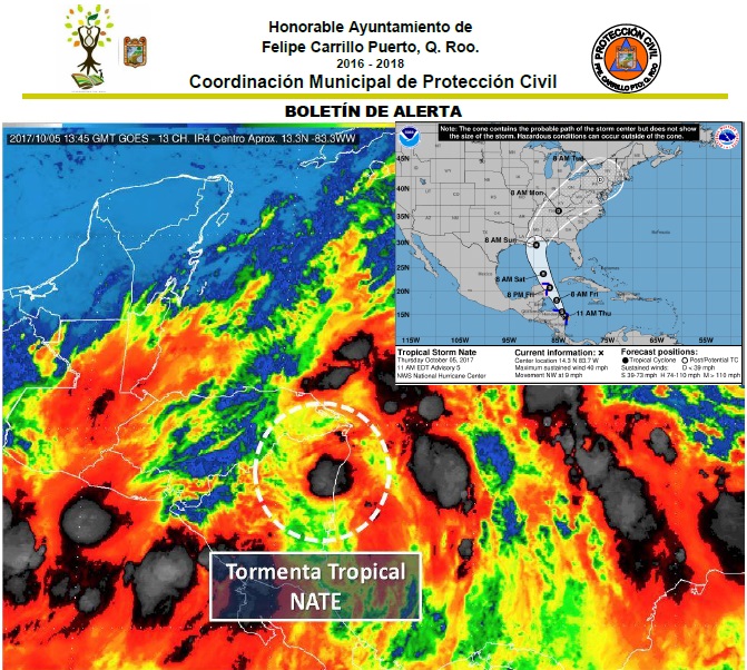 Se espera que la Tormenta Tropical “Nate”; del Mar Caribe se localice el día de mañana a las 06:00 hrs., en las coordenadas 18.1° latitud norte y 85.4° longitud oeste; aproximadamente a 231 km., al este de Xcalak, Quintana Roo; manteniendo la categoría de Tormenta Tropical “Nate”.